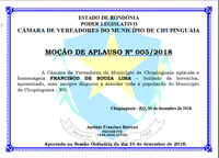 A Câmara Municipal de Chupinguaia, por autoria do vereador Antonio Francisco Bertozzi, entregou a Moção de Aplausos ao senhor Francisco de souza Lima, nesta segunda-feira, 10, no Plenário da Câmara Municipal. O Senhor Francisco de Souza Lima, nasceu na cidade de Santa Quitéria do Estado do Ceará em 28 de agosto de 1927,, filho de Sebastião Souza Lima e Joana de Souza Lima. O mesmo morou em Santa Quitéria até seus 16 anos, depois se mudou para Fortaleza onde serviu o Exército. No ano de 1960 ele começou a extrair seringa, o primeiro seringal em que trabalhou foi em Mutum, Rio Arino-MT, nesse seringal trabalhou por 26 anos, e em seguida foi trabalhar no Seringal Rio de Sangue. Em 1965 veio para Rondônia e continuou a trabalhar na extração de Seringa, no seringal localizado no Rio do ouro. No dia 20/01/1972 casou-se com Nicolina Tolentino de França e teve seus 7 filhos, Domingos de Souza Lima, Daniel de Souza Lima, Francisco Souza Lima Junior, Valdete de Souza Lima, Edson de Souza Lima, Rosineide de Souza Lima e Luiz Aparecido Souza Lima, onde a maioria dos filhos e netos residem no Município. O Senhor Francisco extraiu seringa por aproximadamente 26 anos, encerrou seus trabalhos na Extração da Seringa, no Rio do Ouro Aldeia Tubarão. Seu Francisco ainda participou da Associação dos Seringueiros e Sindicato dos Saldados da Borracha do Sul de Rondônia. Sua primeira aposentadoria foi como trabalhador Rural, depois de alguns anos conseguiu então se aposentar como Soldado da Borracha onde há 18 anos é residente e domiciliado na Rua: Altino Manuel de Oliveira 2385, com sua esposa. Hoje com 91 anos de idade, o Senhor Francisco contribuiu grandemente no desenvolvimento do nosso Município, onde passou por todas as etapas de fundação e vive da aposentadoria dele e de sua esposa. Portanto, a Câmara de Vereadores aprovou por unanimidade a Moção nº 005/2018, que aplaude e homenageia o senhor Francisco de Souza Lima , pelos relevantes serviços prestados à população chupinguaiense, e por sua contribuição ao desenvolvimento do nosso município.